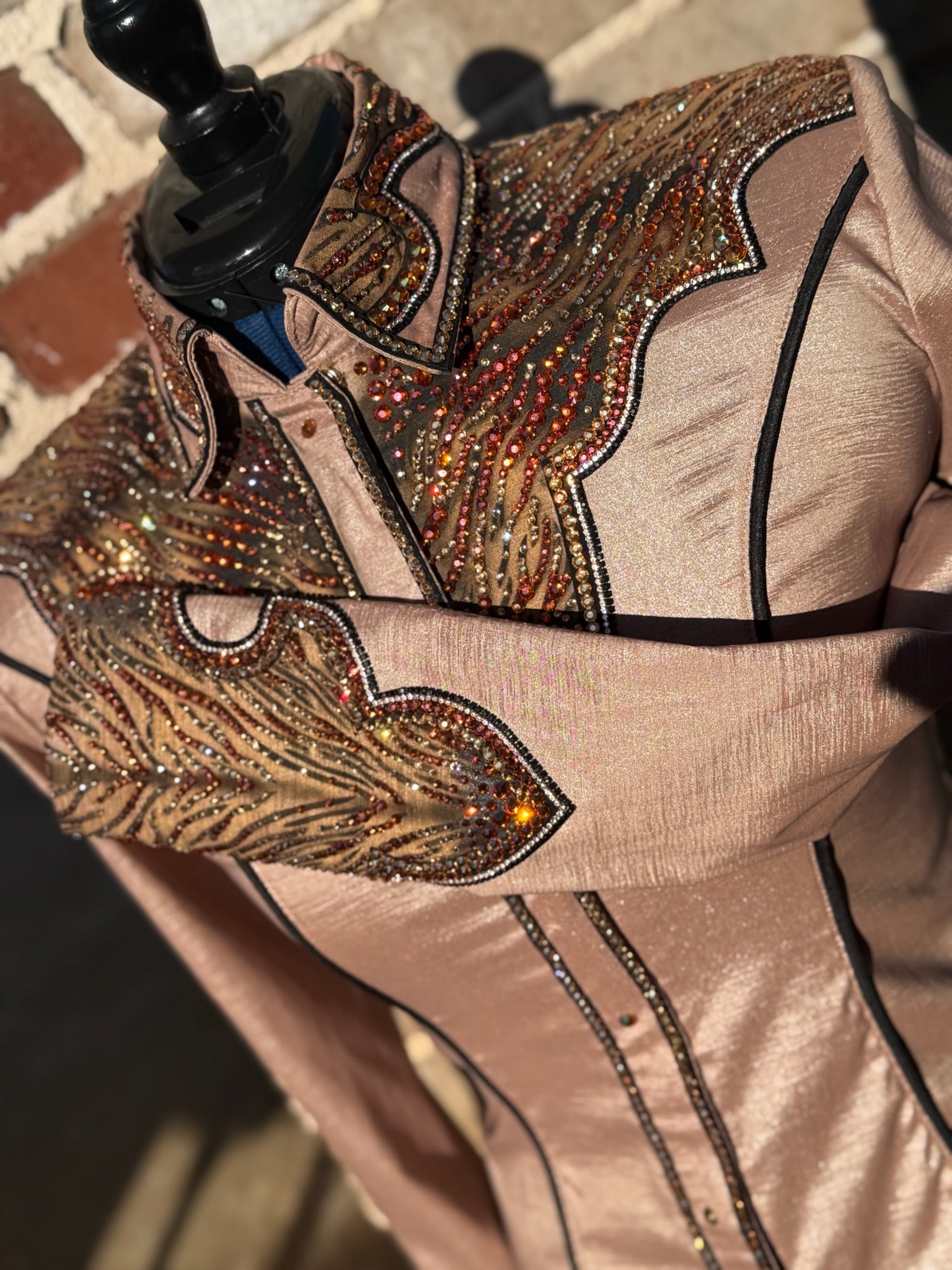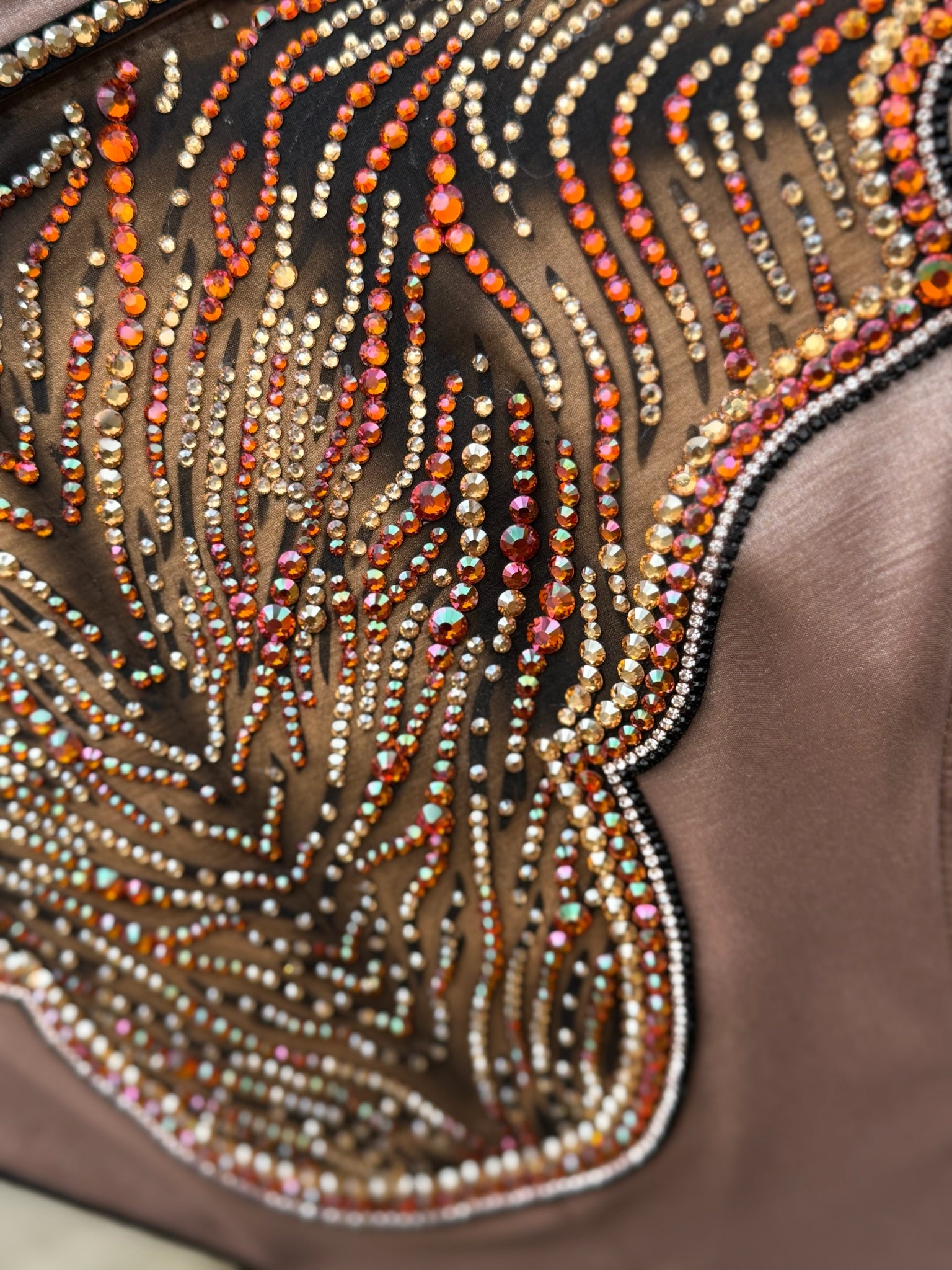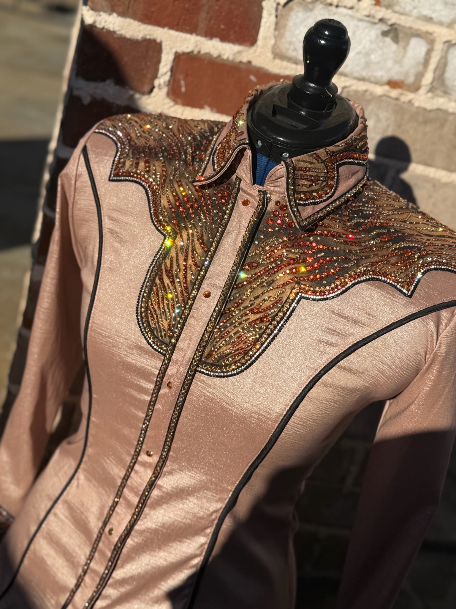Brown shimmer stretch taffeta base day shirt with amber, golden shadow, and gold accents.
