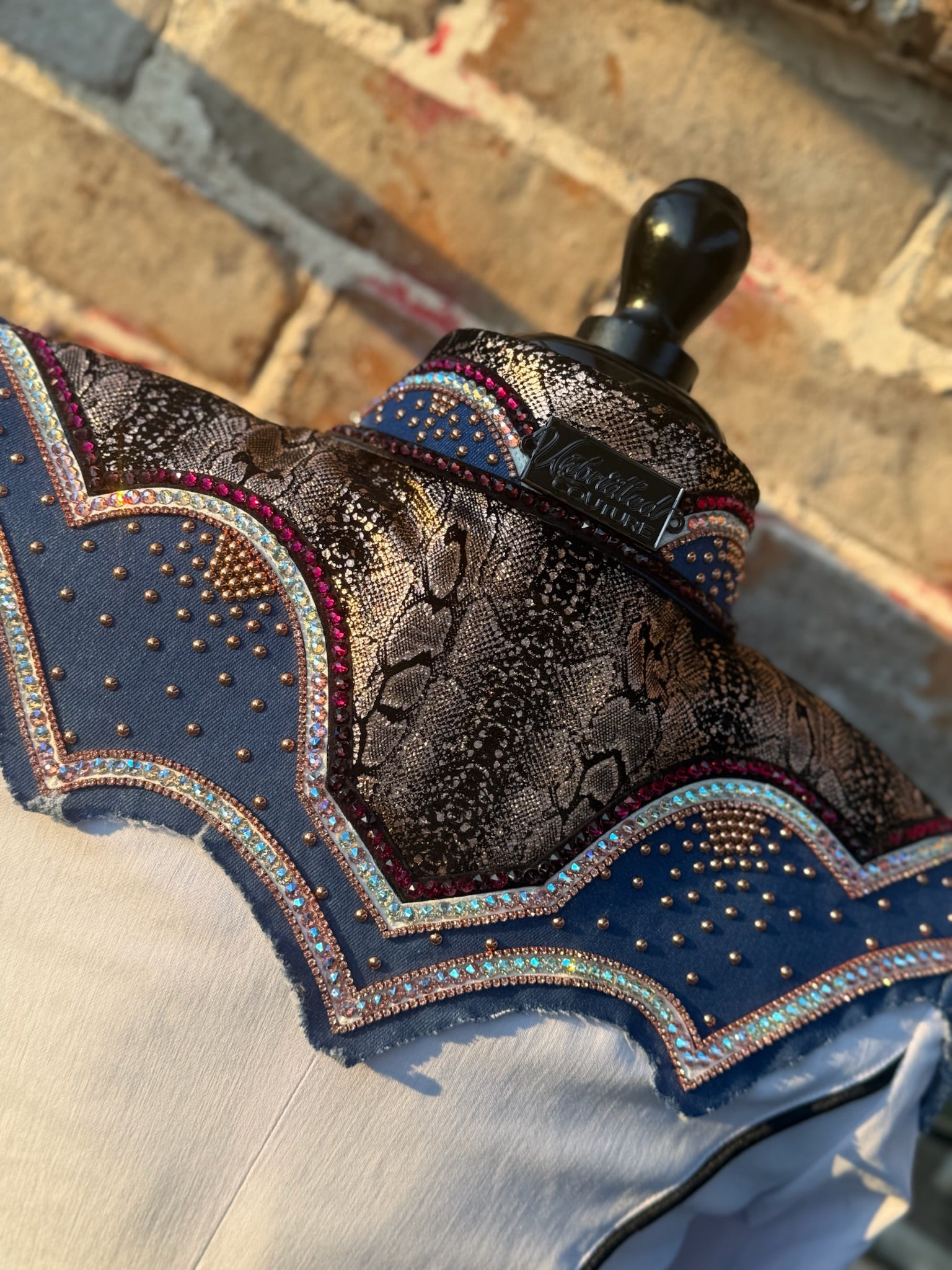 White stretch taffeta base day shirt with denim, silk shimmer, ruby, and rose gold accents.