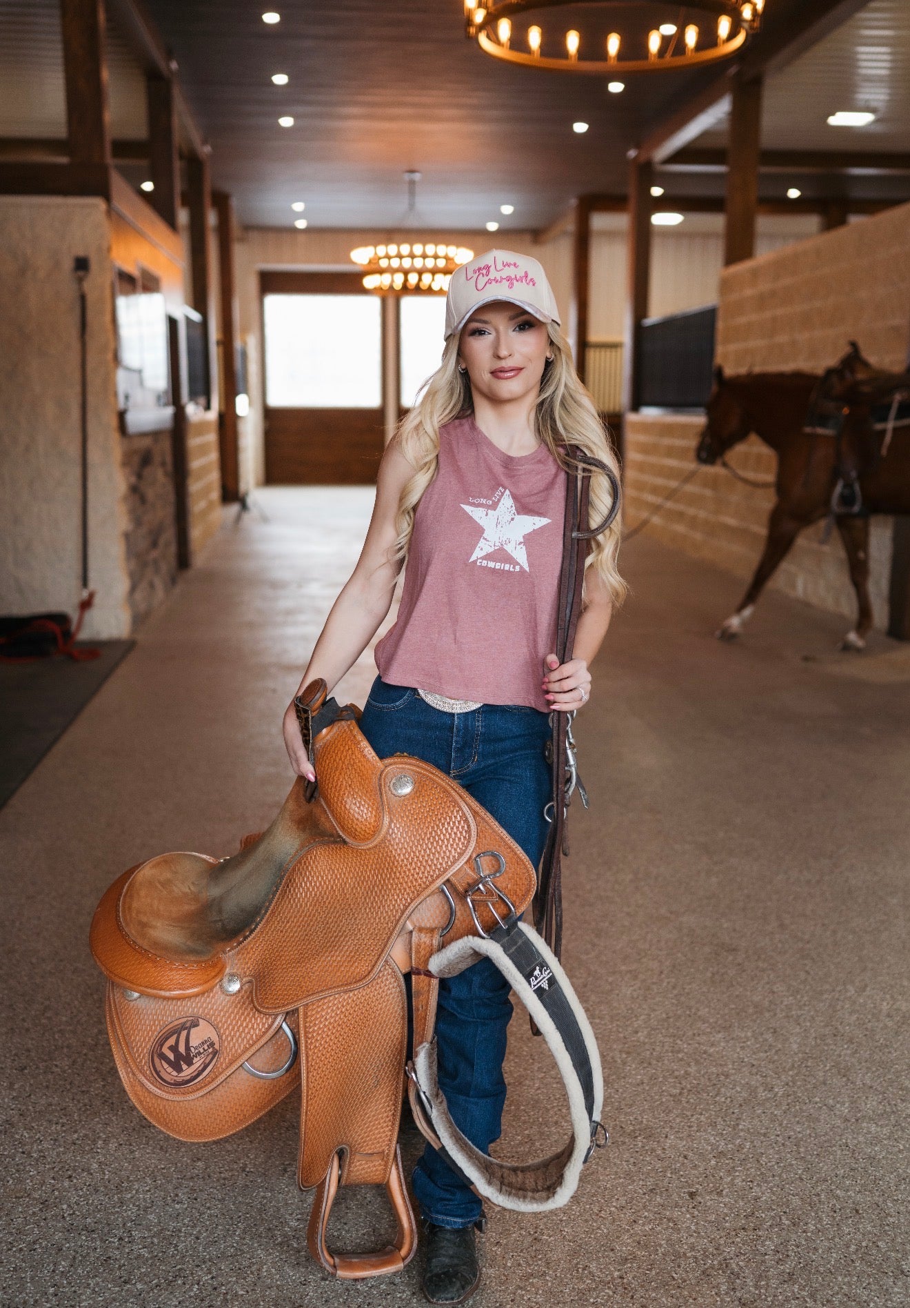This dusty pink/mauve tank features a distressed white star graphic on the front with “Long Live Cowgirls” printed in bold white lettering. The vintage-inspired distressing gives it that perfectly worn-in feel, while the feminine hue keeps it effortlessly flattering.