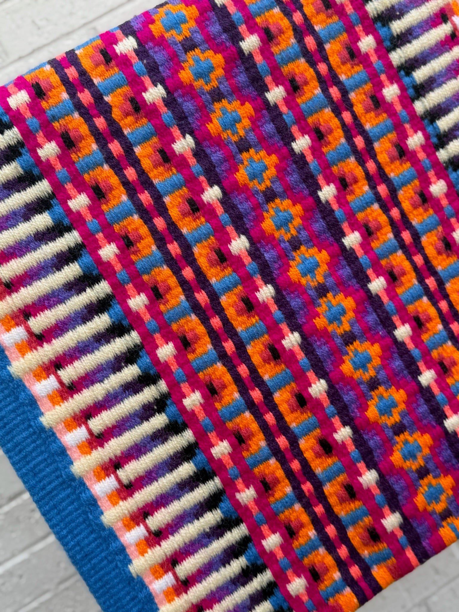 Blue edge; a mix of shades of purple, fuchsia, coral, orange, and blue with black & white accents.