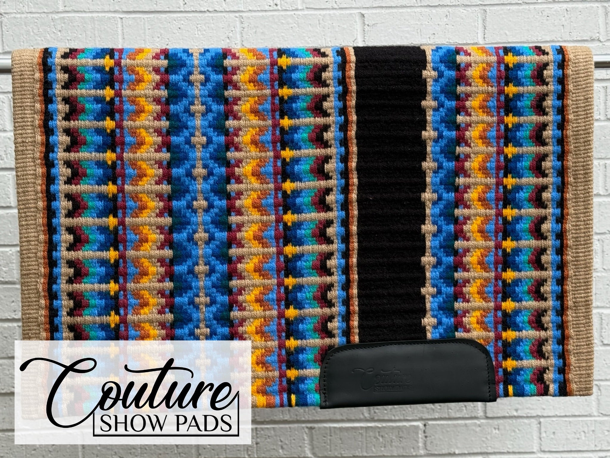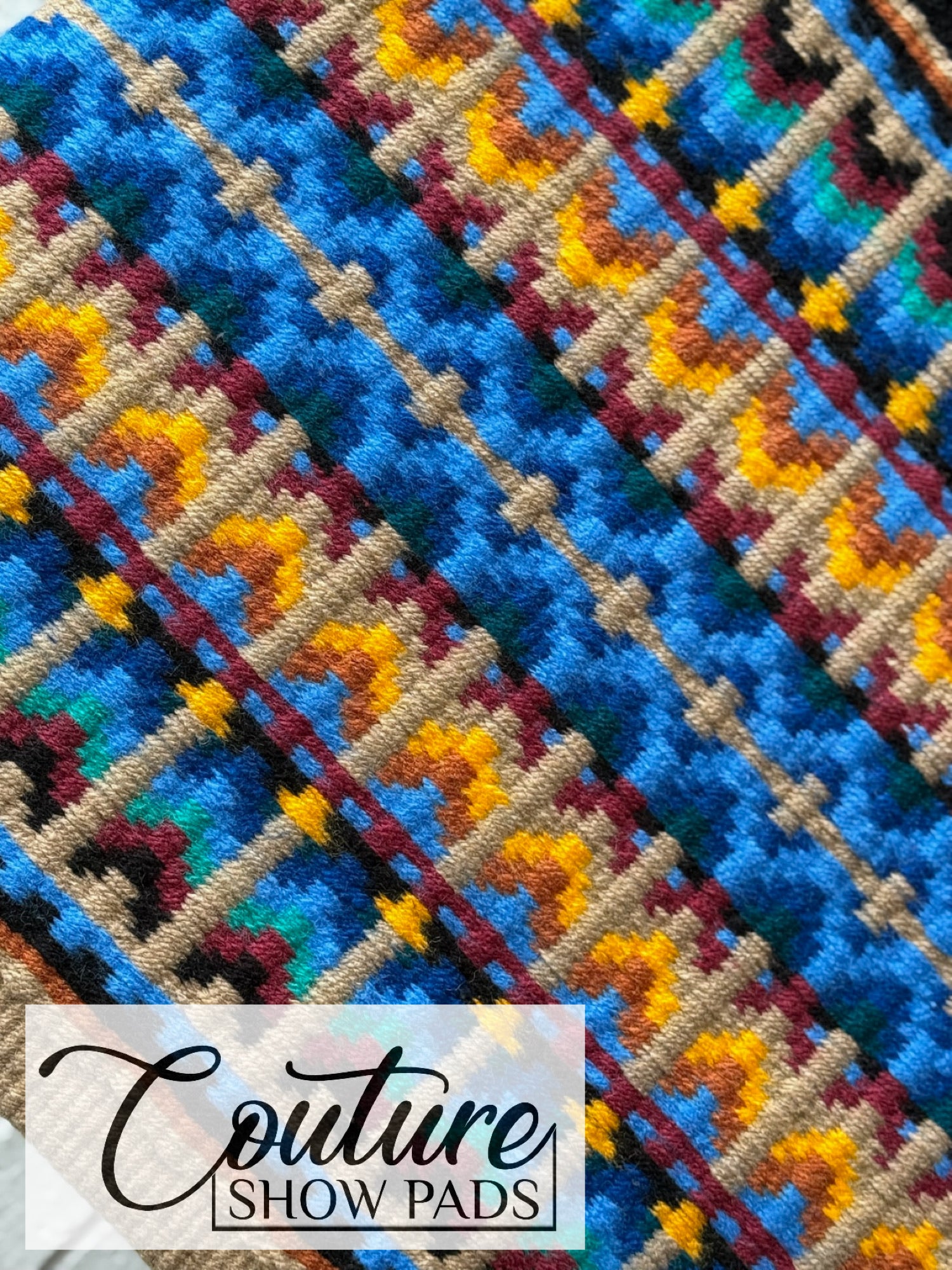 Gold edge; a mix of shades of blue, yellow, teal, burgundy, and rust with black & tan accents.