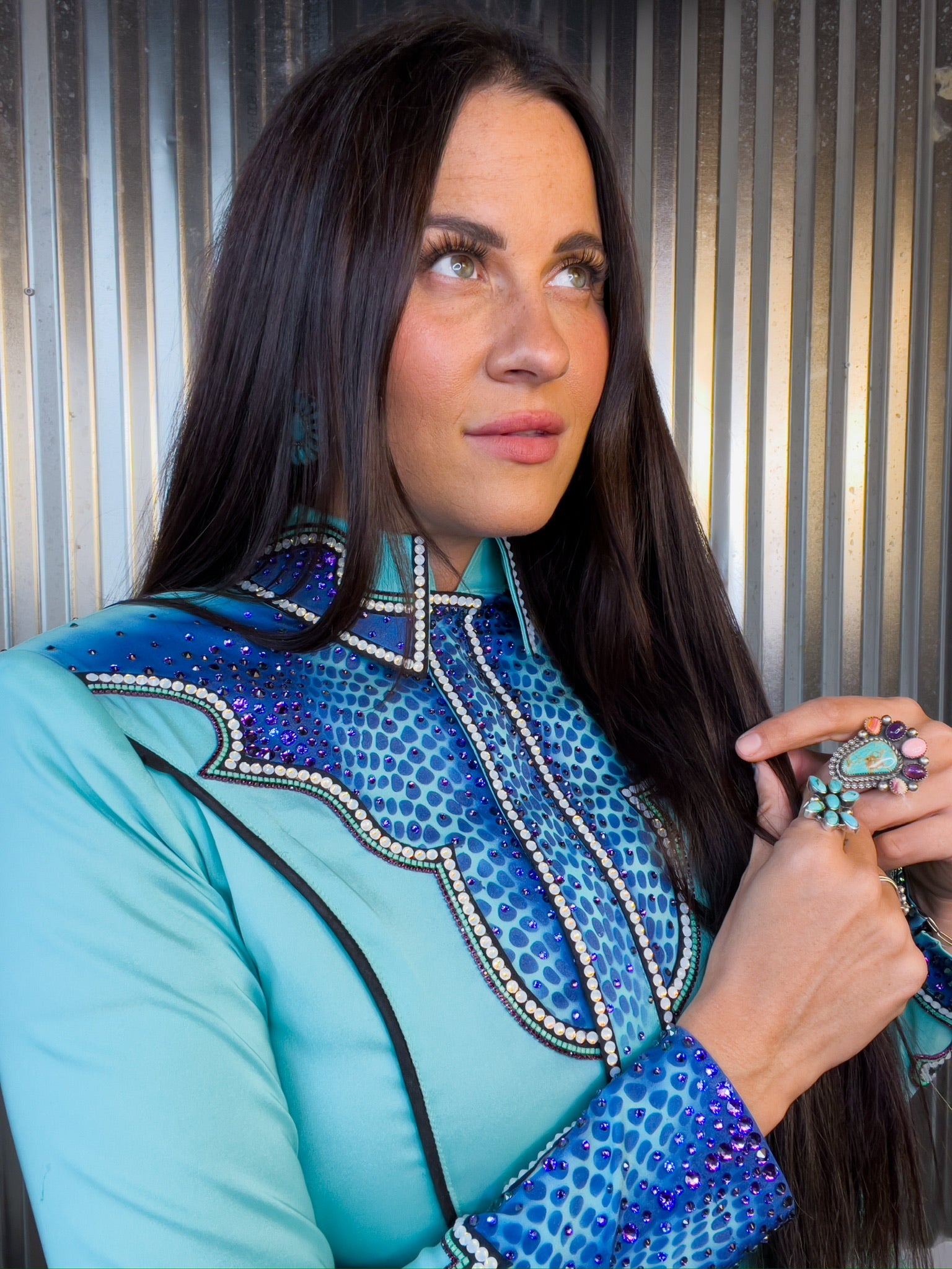 Turquoise stretch taffeta base day shirt with heliotrope and white opal accents.