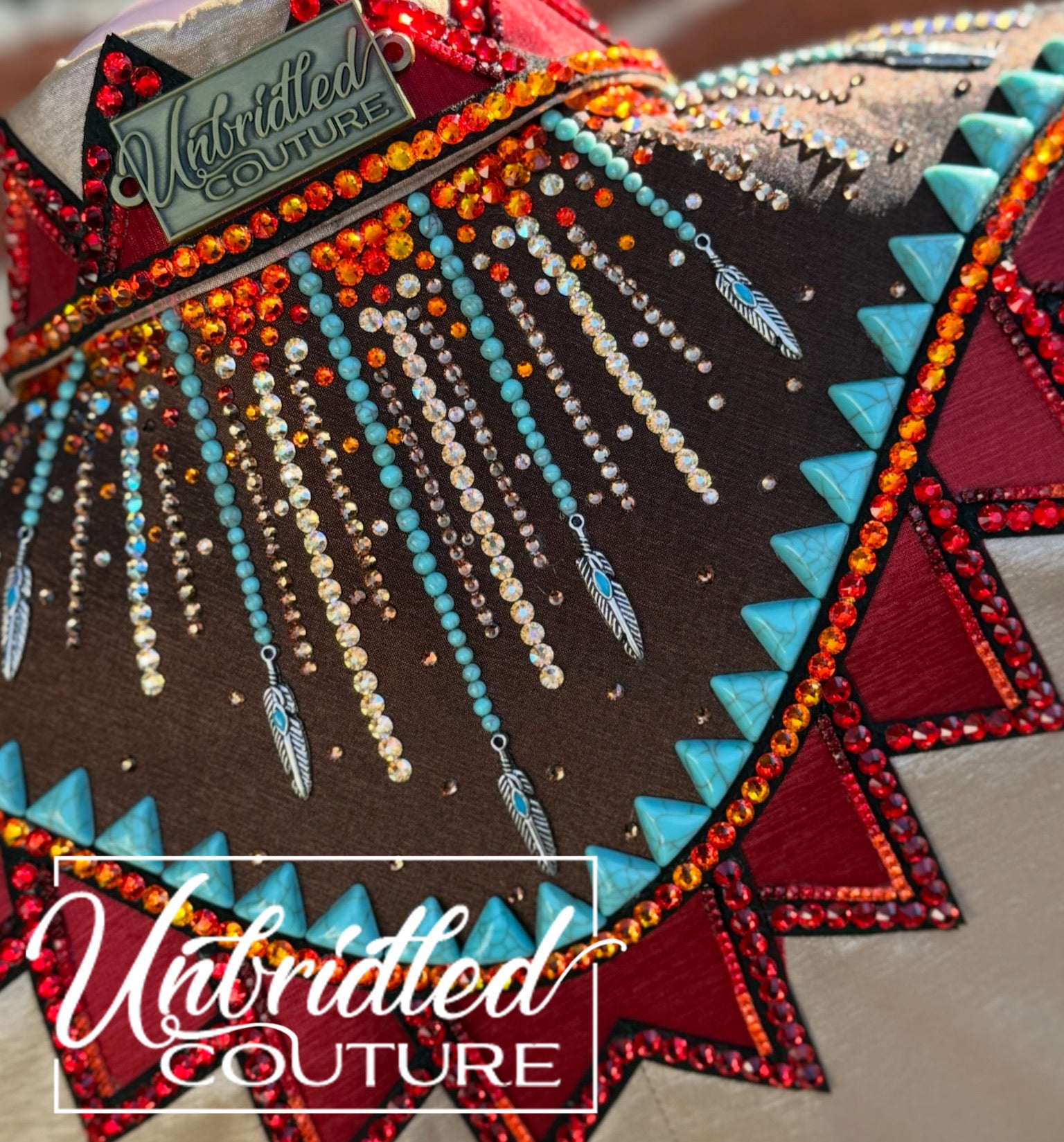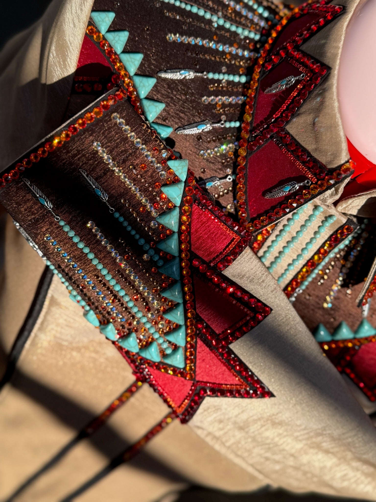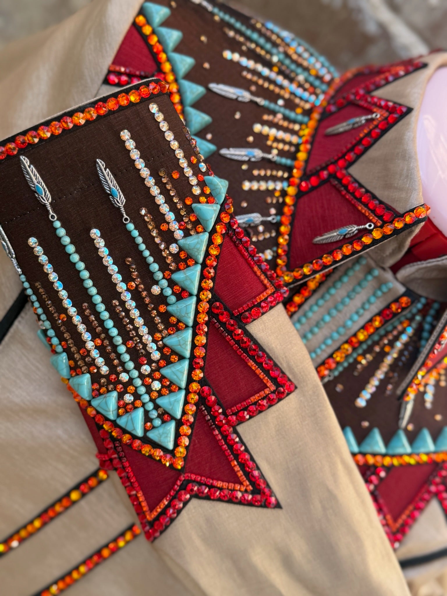 Tan shimmer stretch taffeta base day shirt with turquoise, fire opal, scarlet, ruby red, and silver metal accents.