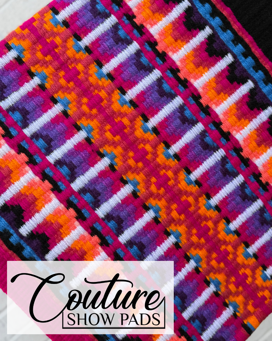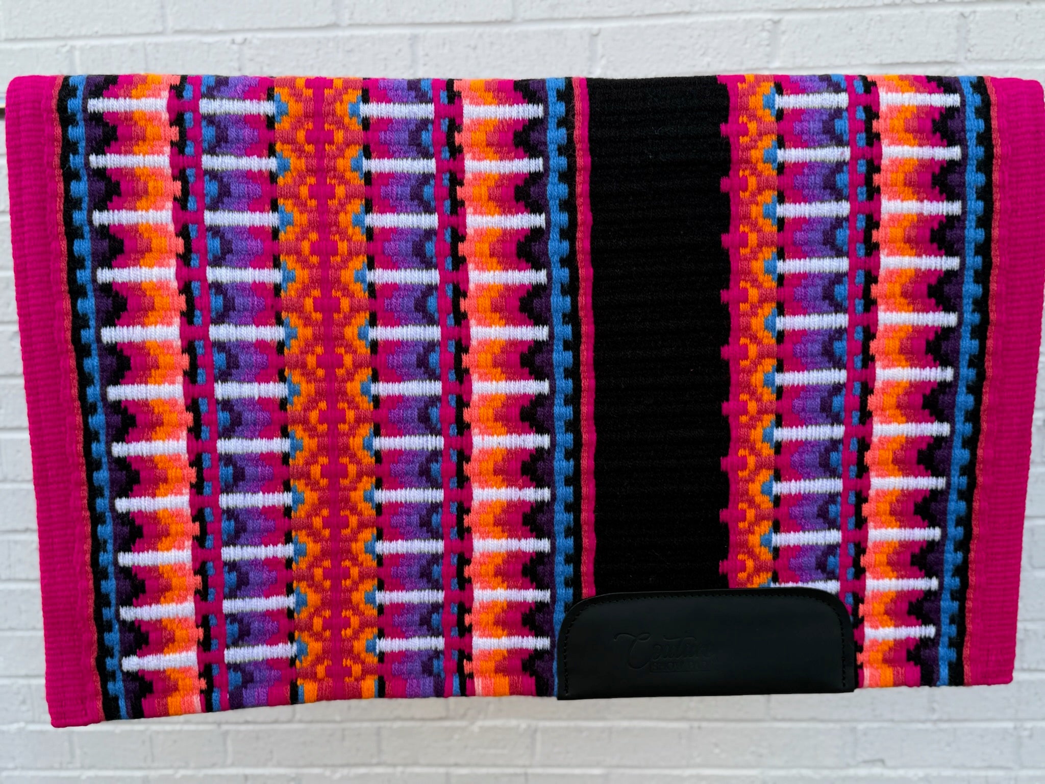 Dark pink edge; a mix of shades of blue, pink, purple, and orange with black & white accents.