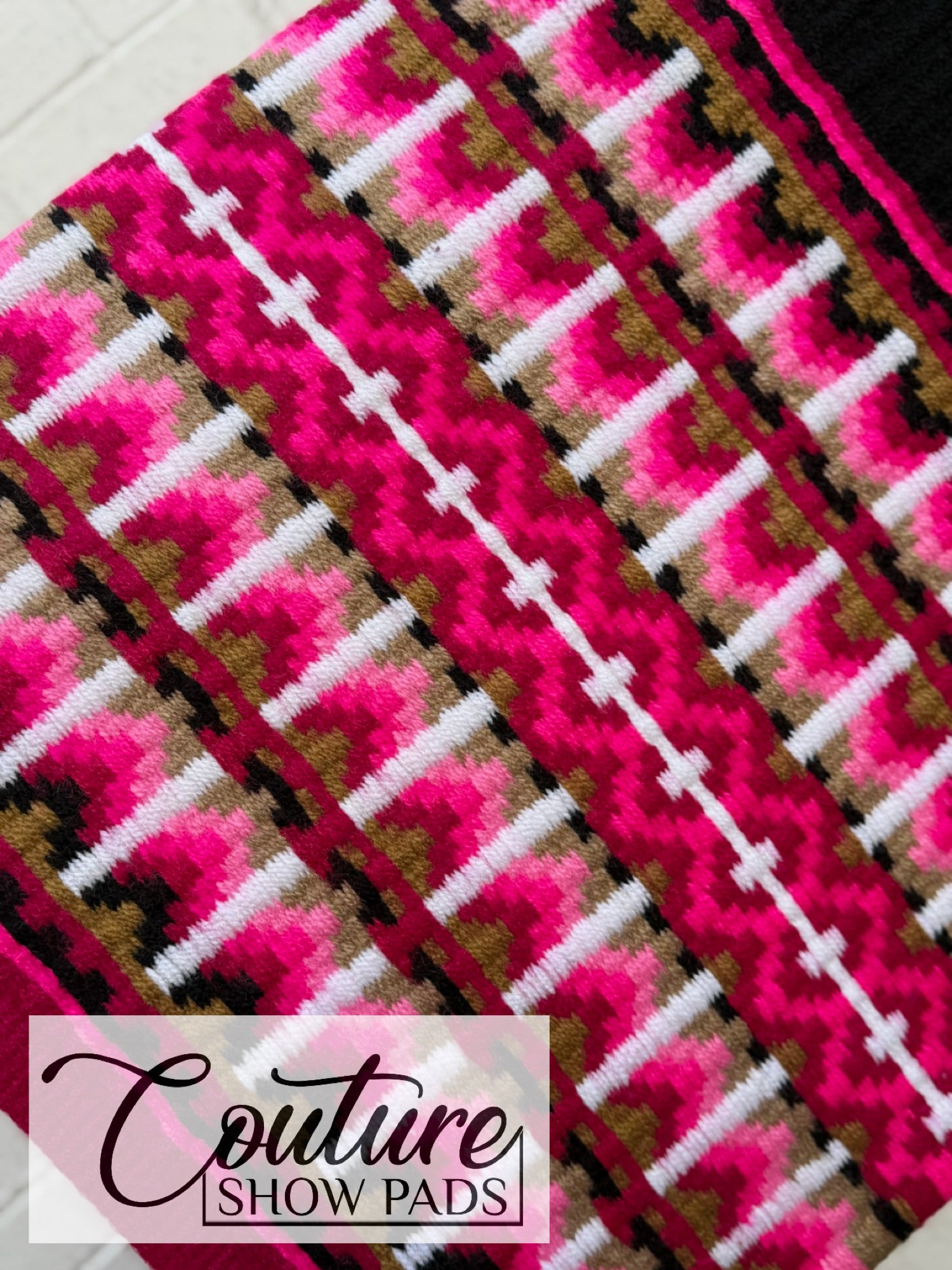 Dark pink edge; a mix of shades of pink, tan, and gold with black & white accents.