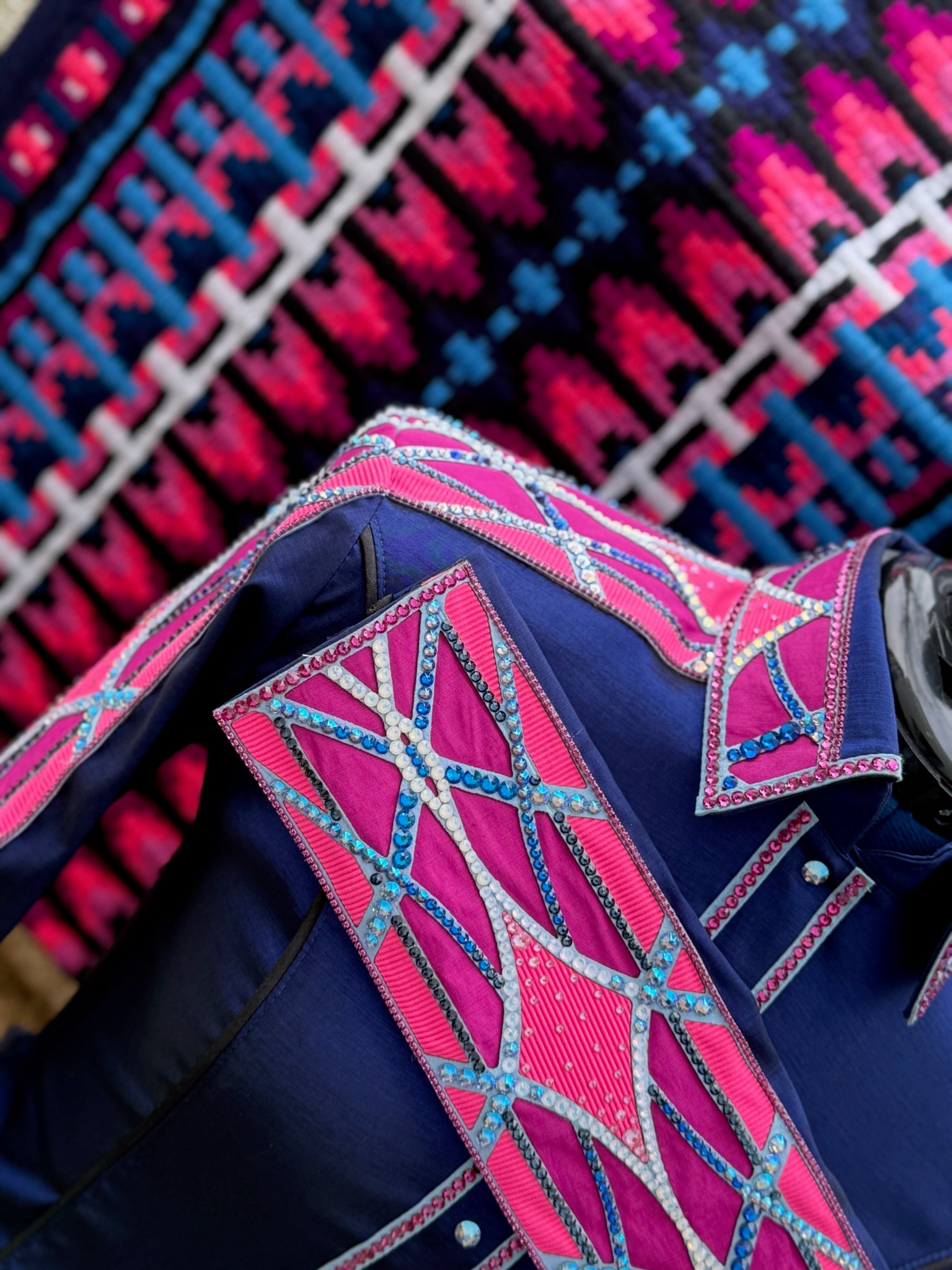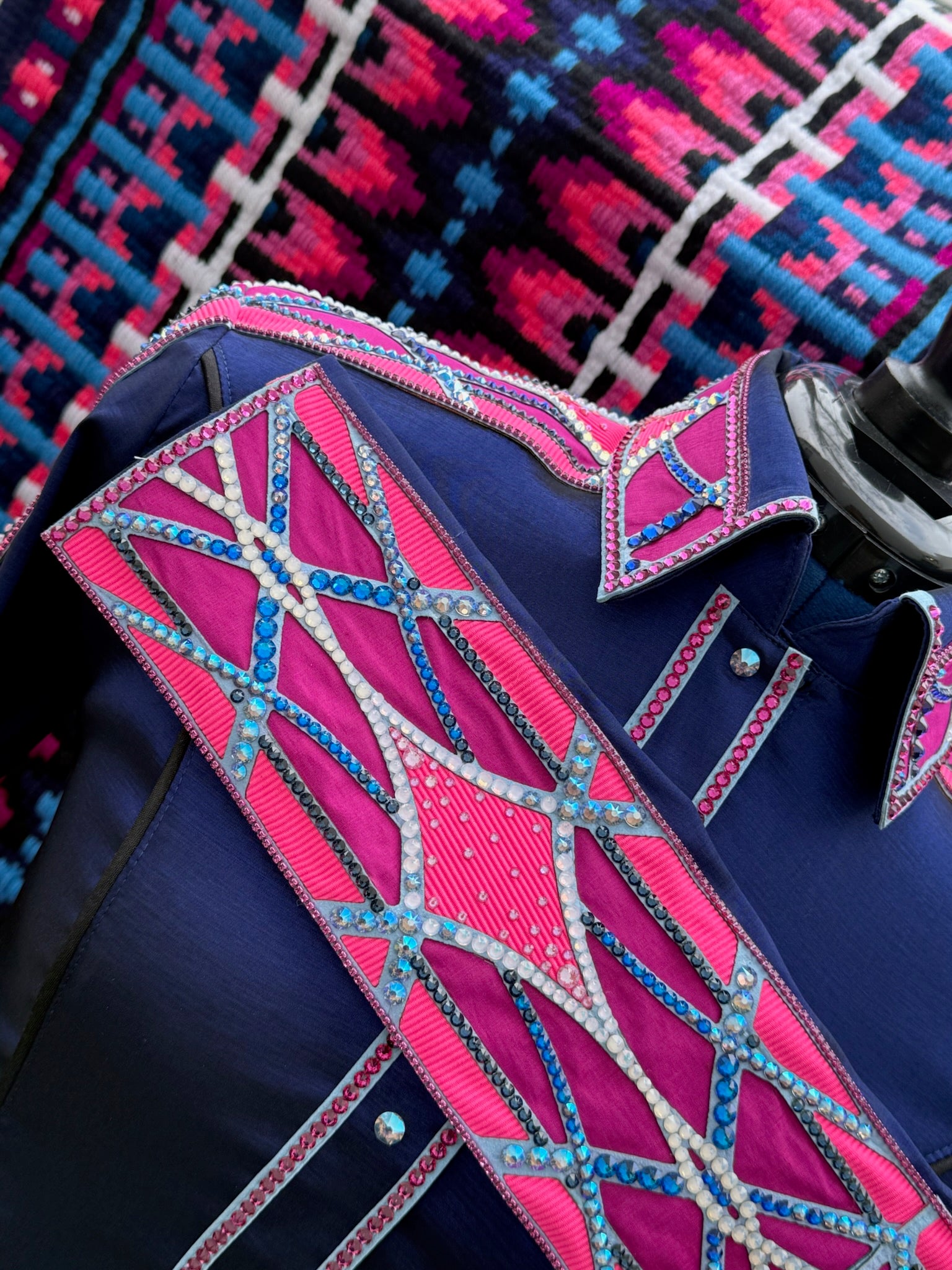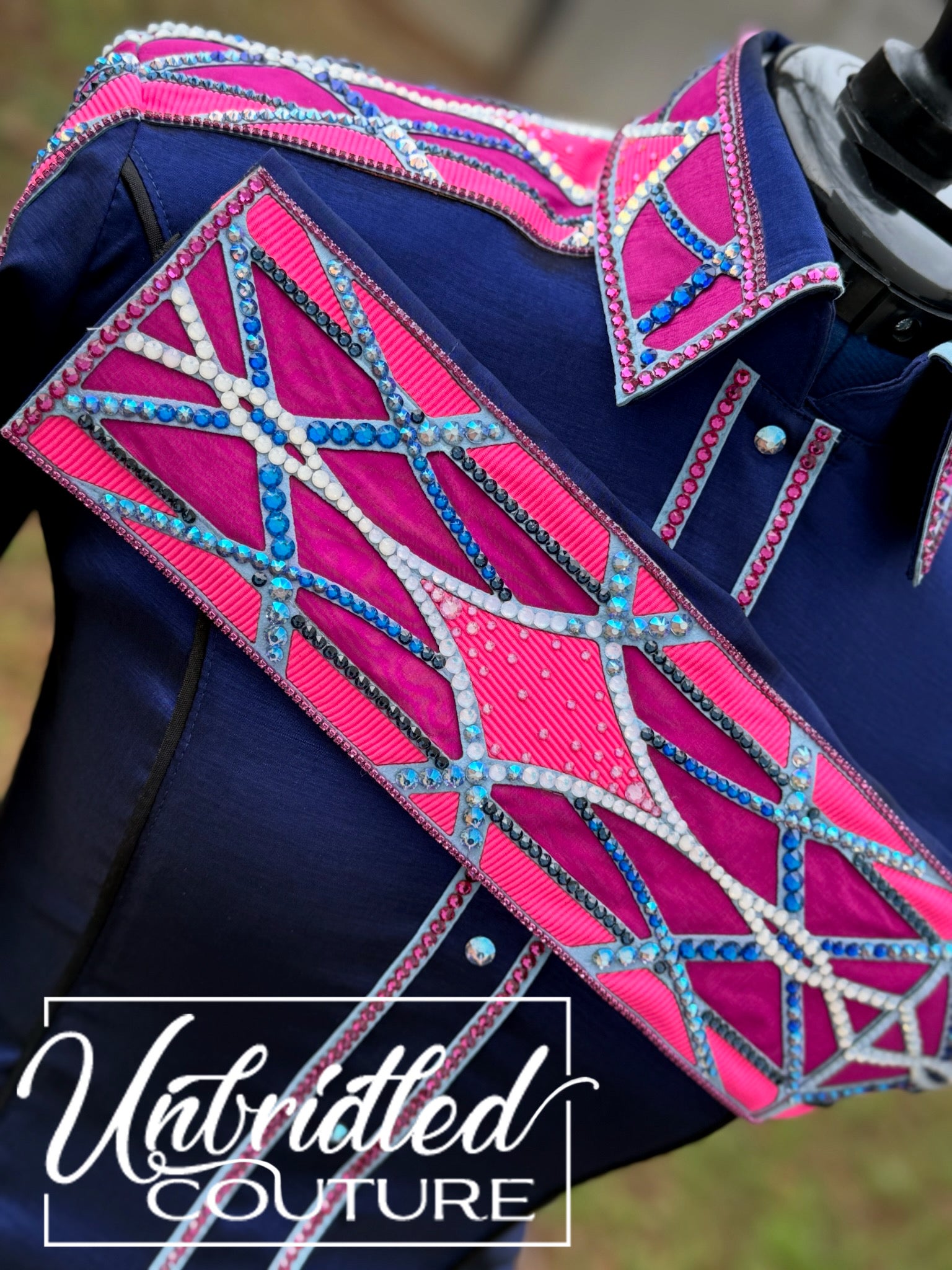 Navy stretch taffeta base day shirt with turquoise, blue, pink, and white opal accents.