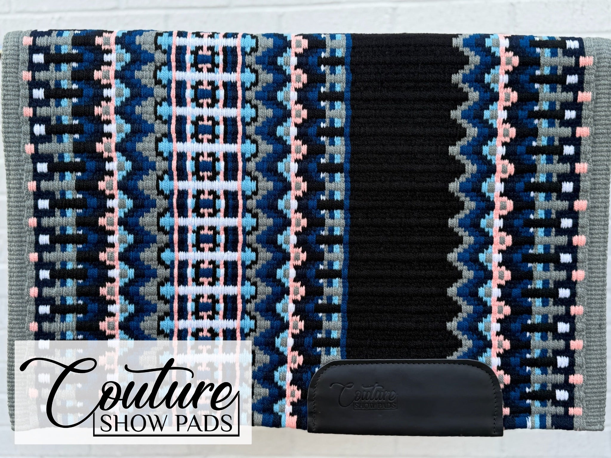 Gray edge; a mix of shades of blue, navy, pink, and gray with black & white accents.