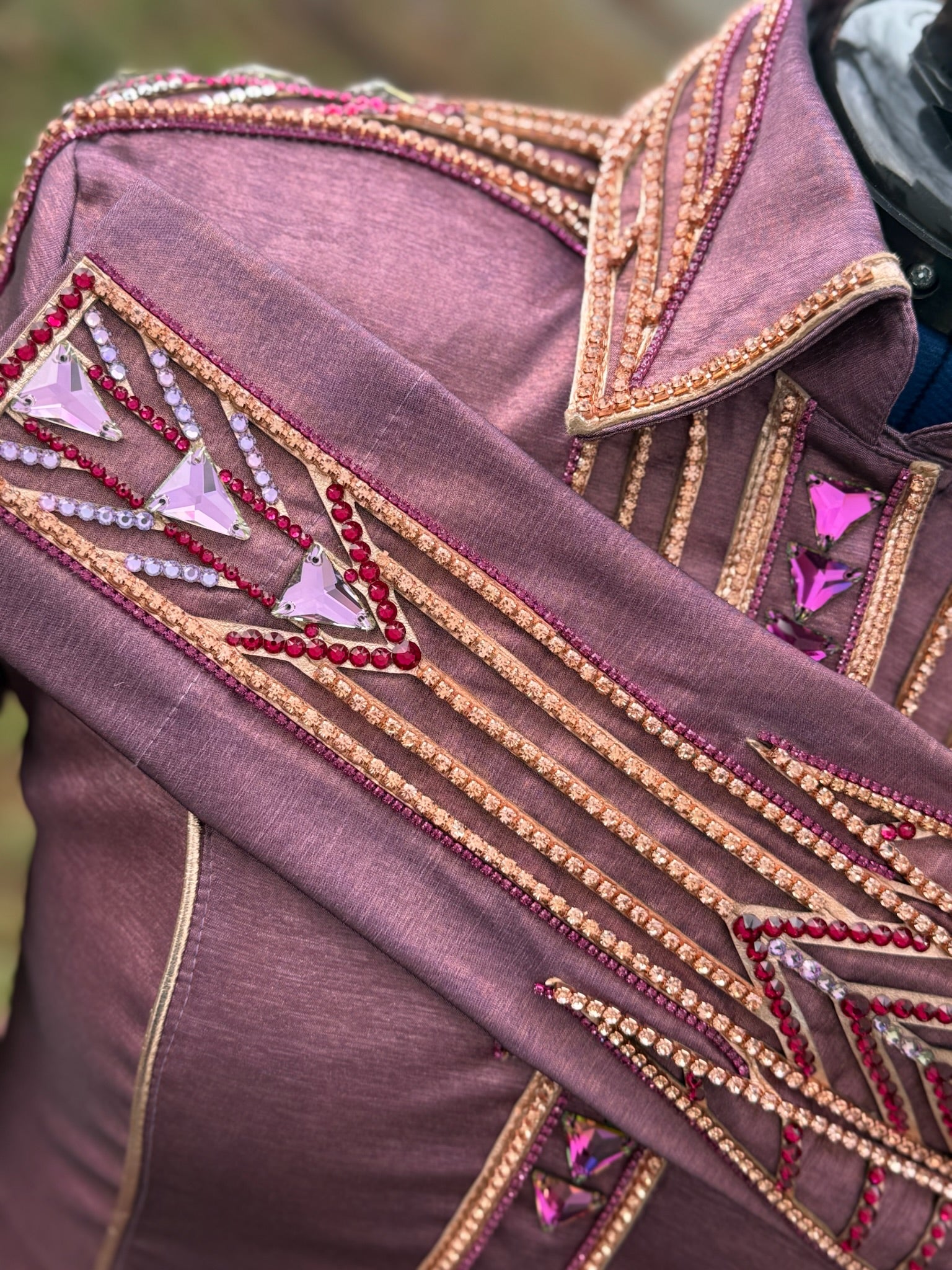 Purple Copper shimmer stretch taffeta base day shirt with lavender, scarlet, purple, and rose gold accents.