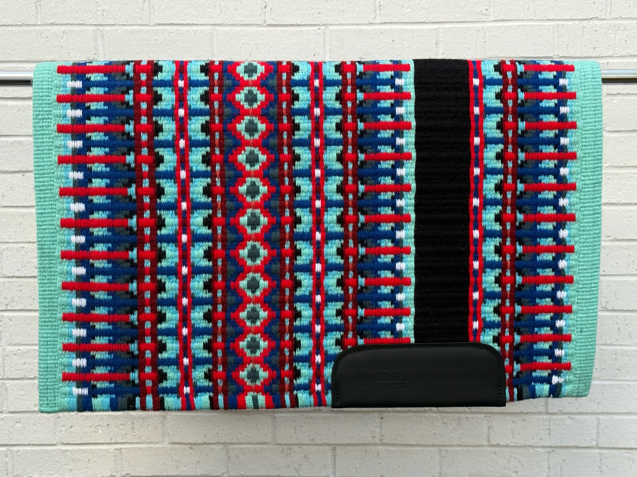 Mint edge; a mix of shades of blue, mint, turquoise, red, and burgundy with black & white accents.