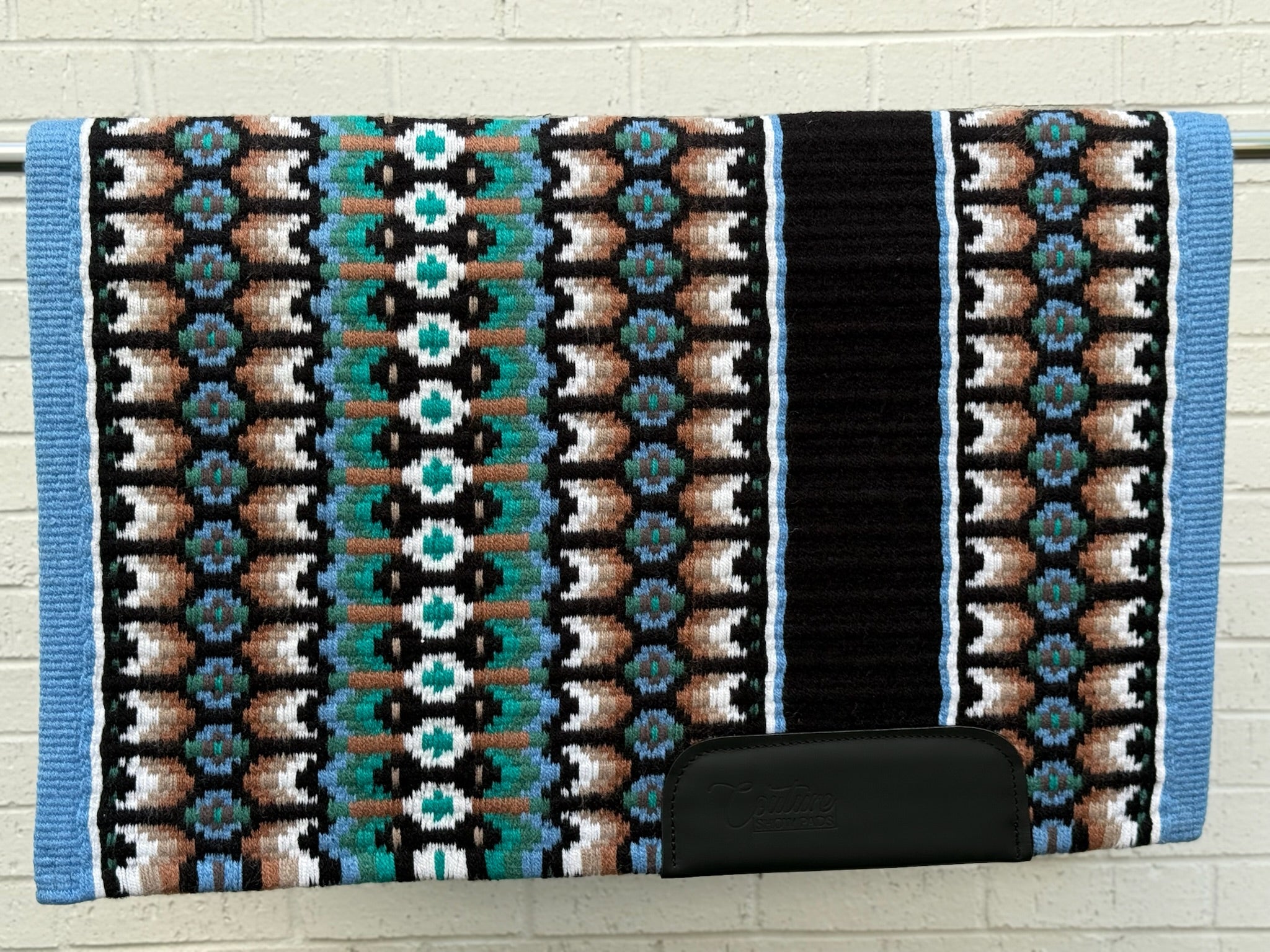 Blue edge; a mix of shades of blue, teal, tan, brown, and green with black & white accents.
